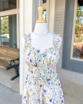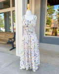 Chic and romantic, this floral tiered maxi features a delicate wildflower print on ivory fabric. Designed with smocked straps, a ruffled sweetheart neckline, and a playful gingham bow accent.